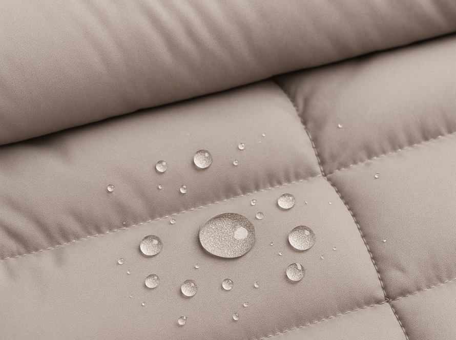 Durable puffer jacket fabric featuring water-repellent performance and soft handfeel.